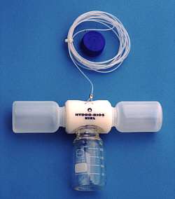 För att ta upp prov på olja på vattenytan använder man lämpligen en speciell provtagare "Schuemacher", vilken är så balanserad att den endast skummar av ytan och fåledes får mest olja och minst vatten. Lätt utbytbara provflaskor. Ytterst enkel att använda. Hydro-Bios tillverkar hämtaren.